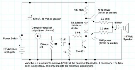 Here is a simple amplifier for boosting the audio level from low-power sound cards or other audio sources driving small speakers like toys or small transistor radios. The circuit will deliver about 2 watts as shown. The parts are not critical and substitutions will usually work. The two 2.2 ohm resistors may be replaced with one 3.9 ohm resistor in either emitter.