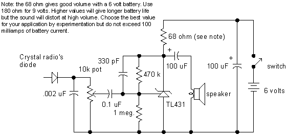 Here is a simple audio amplifier using a TL431 shunt regulator. The amplifier will provide room-filling volume from an ordinary crystal radio outfitted with a long-wire antenna and good ground. The circuitry is similar in complexity to a simple one-transistor radio but the performance is far superior. The TL431 is available in a TO-92 package and it looks like an ordinary transistor so your hobbyist friends will be impressed by the volume you are getting with only one transistor! The amplifier may be used for other projects, too. Higher impedance headphones and speakers may also be used. An earphone from an old telephone will give ear-splitting volume and great sensitivity! The 68 ohm resistor may be increased to several hundred ohms when using high impedance earphones to save battery power.