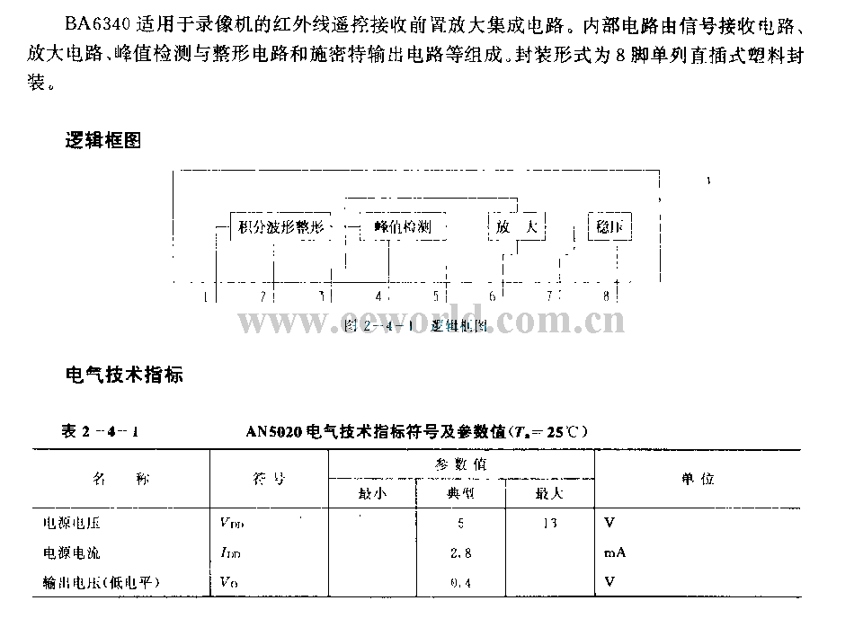 BA6340 is suitable for the VCR 's infrared remote control receiver preamplifier integrated circuit. Internal circuit consists of the signal receiving circuit, amplifier circuit, peak detector, shaping circuit and the Schmitt output circuit, etc. It uses 8-pin single in-line plastic package.