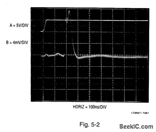 Figure 5-1 shows an amplifier that is suitable for the output of a fast 12-bit DAC (digital-to-analog converter, Chapter 8). Figure 5-2 shows clean 0.01% settling in 280 ns (trace B) to an all-bits-on input step (trace A). LINEAR TECHNOLOGY, APPLICATION NOTE 47, P. 32.