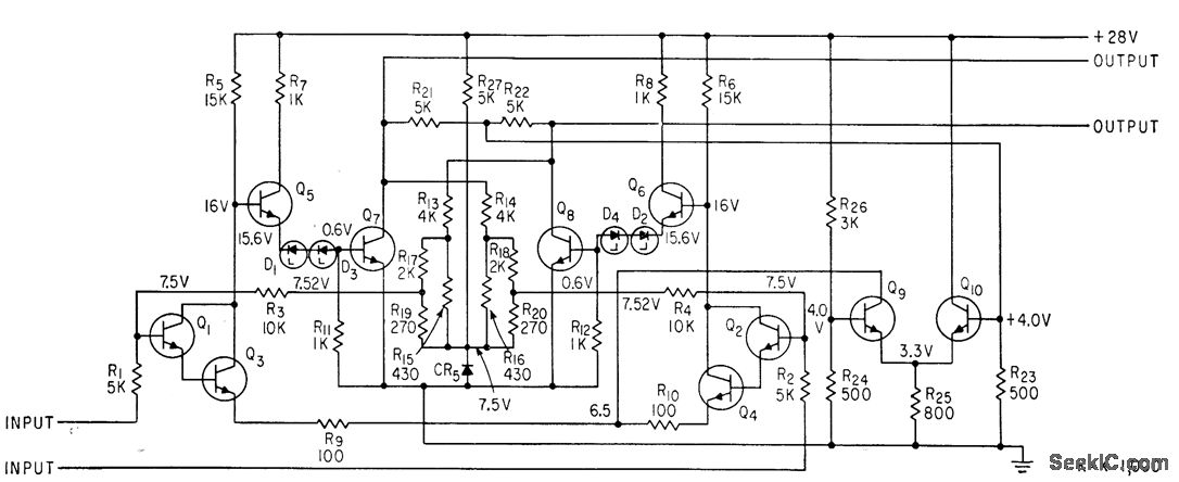 Open-loop gain of differential forward amplifier Q1 through Q8 is over 2,000 and dosed-loop gain is 200. Signal across output of common-mode feedback amplifier Q9-Q10 is differentially summed by R21-R22 to cancel a-c components, while d-c component is amplified and applied to emitters of differential-input Darlington pair.-M. W. Aarons, Putting a Servo Amplifier on a Small Silicon Wafer, Electronics, 35:52, p 33-35.