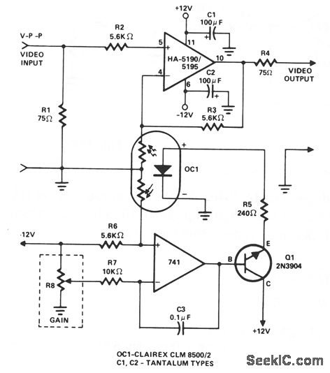 This amplifier employs a cascaded op amp inte-grator and transistor buffer, Q1, to drive the gain control element. Except for a simple modification, the HA-5190/5195 stage is connected as a conven-tional noninverting op amp, and includes input and output impedance matching resistors RI and R4, respectively, series stabilization resistor R2, and power supply bypass capacitors C1 and C2. The circuit differs from standard designs in that the gain control network includes a photoresistor, part of OC1. The optocoupler/isolator OC1 contains two matched photoresistors, both activated by a common LED. The effective resistances offered by these devices are inversely proportional to the light emitted by the LED. One photoresistor is part, with R3, of the HA-5190/5195 gain network, while the other forms a voltage-divider with R6 to control the bias applied to the integrator noninverting terminal.In operation, the dc voltage supplied by gain control R8 is applied to the integrator inverting input terminal through input resistor R7. Depending on the relative magnitude of the control voltage, the integrator output will either charge or discharge C3. This change in output, amplified by Q1, con-trols the current supplied to the OC1 LED through series limiting resistor R5. The action continues until the voltage applied to the integrator noninverting input by the R6-photoresistor gain network is changing, adjusting the op amp stage gain. As the control voltage at R8 is readjusted, the OC1 photoresistances track these changes, automatically readjusting the op amp in accordance with the new control voltage setting.