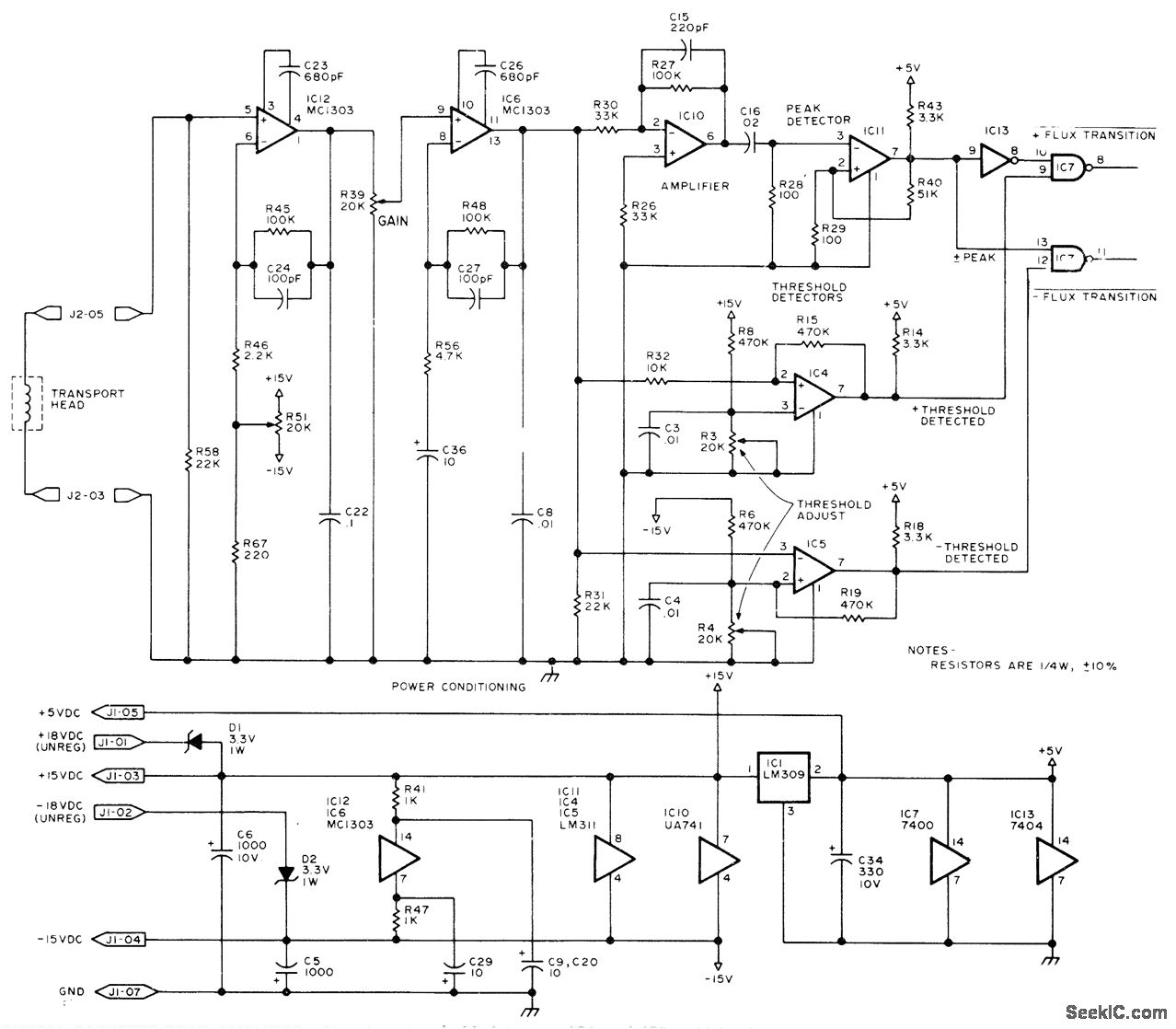 Signal from magnetic head of digital tape cassette is amplified by two-stage MC1303 amplifier providing analog output of about 4 V P-P to μA741 opamp IC10 of LM311 peak detector 1C11. Signal also goes to LM311 positive and negative threshold detectors is low; above reference, output is high. Negative threshold detector operates similarly for negative pulses. Time jitter in outputs is eliminated by detecting peak of analog read signal, then combining result with threshold in. formation in peak detector. Circuit is used ; Phi-Deck cassette system made by Economy Company, Oklahoma City.-I, Rampil and J. Breimeir, The Digital Cassette Subsystem: Dig-ital Recording Background and Head Interface Electronics, BYTE, Feb. 1977, p 24-31.