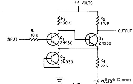 Uses include pulse width modulation of d-c voltage for switching amplifiers, wave shaping, and voltage or current monitoring. Low dynamic resistance of diode formed by Q2 keeps hysteresis (difference between turn-on and turn-off) down to 10 mv.-D. D. Robinson, Diode. Coupled Schmitt Trigger, Electronics, 37:31, p 50-51.
