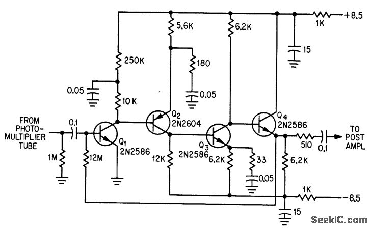 Output of multiplier phototube in orbiting astronomical observatory receives closed-loop amplification of 12 in current-sensing preamplifier over input dynamic current range of 3 to 500 ma. -R. Cuikay and T. Callahan, Orbiting Observatory to Measure Stars' Dim Light, Electronics, 37:9, p 28-31.