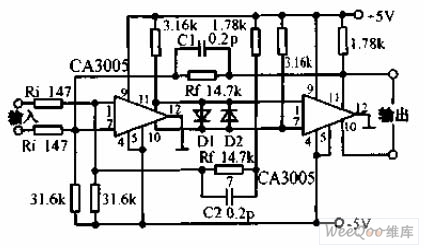 The circuit consists of two CA3005 RF amplifiers, the gain is decided by the ratio Rr / Ri. Capacitors C1, C2 are used to improve the bandwidth to prevent high-frequency self-excitation. Error of resistors is 1%, and the bandwidth is 200MHz, and time delay is 20μs.