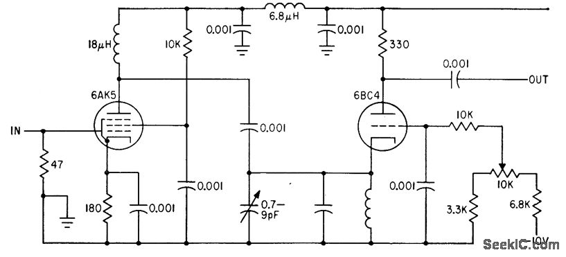 For search radar, potentiometer adjusts bias on 6BC4 tube of 30-Mc i-f preamp to vary bandwidth over range of 200 kc to 15 Mc.-Variable Bandwidth Preamplifier Electronically Varied Between 15 Mc and 200 Kc, Electronics, 35:2, p 102.