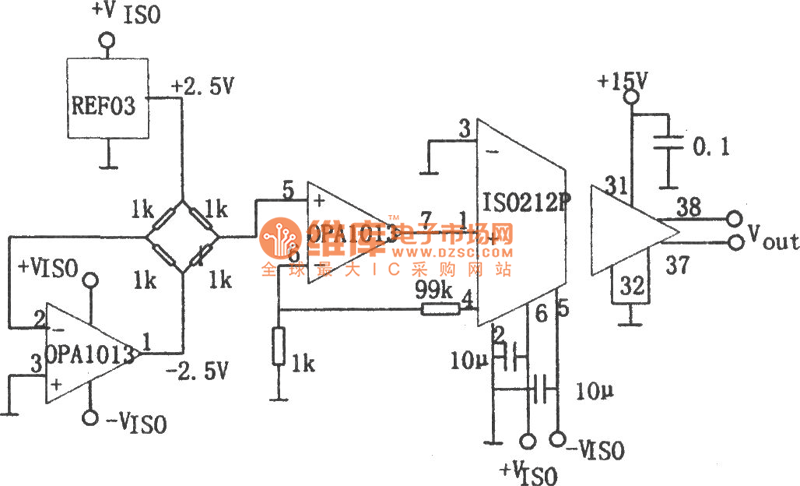 Many sensors, such as the strain gauge platinic resistance, pressure sensor, the gas detection, etc. They use the electric bridge as sampling circuit differential signal. The figure shows the circuit using a single power supply high precision double luck OPA1013 as preamplifier. It uses the double mouth isolation miniaturization isolated amplifier ISO212P as level after isolated amplifier.