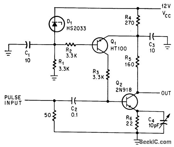 Achieved by precise bias control of Q2 without introducing pclrclsifics in input signal Iine. Gives high gain-band-width product as pulse amplifier.-D. D. McLeod, Bias Control and Low Parasitics Shorten Amplifier Rise Time, Elecnonics, 39:2, p 73-74.