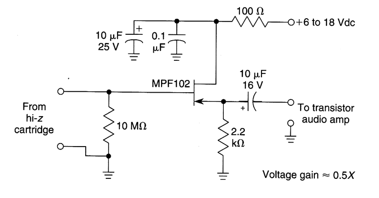 A high-Z phono cartridge can be rnatched to a low-Z amplifier with this circuit. The FET provides a current gain of over 1000x and a voltage gain of about 0.5x.