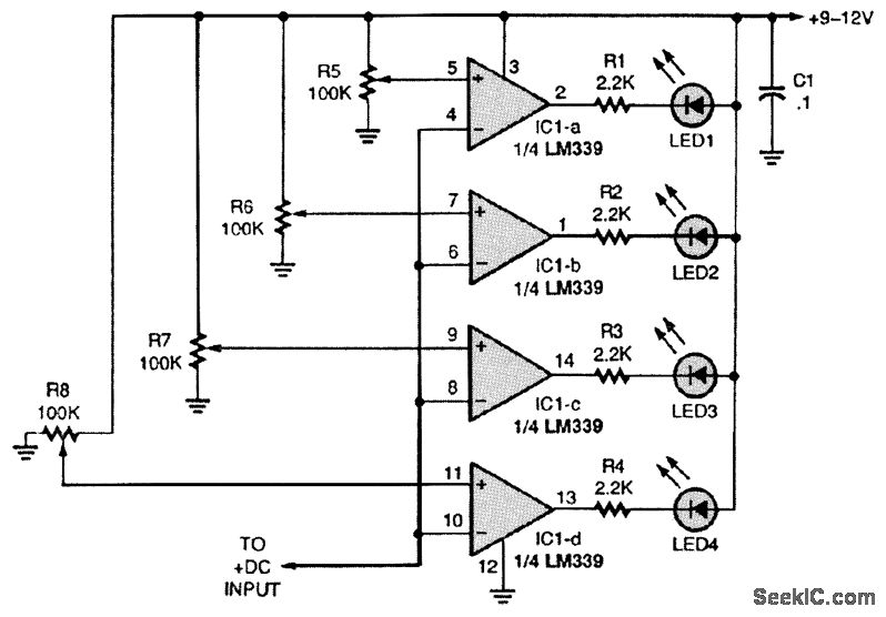 This four-level voltage detector can be used as a bar-graph voltmeter. Simply set each potentiometer (R5 to R8) for a specific voltage.