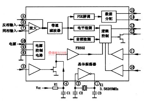 FX602 is an integrated frequency shift keying(FSK) demodulation circuit of wireless phones, which is used in caller display system of wireless and wiring phone at home and abroad.1.the internal circuitFX602 is often used with microcomputer systems to fulfill the functions of FSK.