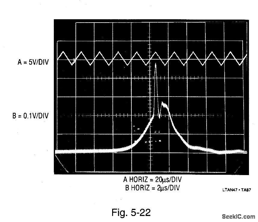 Figure 5-21 shows a circuit that permits one particular portion of a signal to be amplified (or examined) with all other portions rejected. Figure 5-22 shows what happens when the output of a triangle-wave generator (trace A) is applied to the circuit. Setting the bias level just below the triangle peak permits high-gain, detailed observation of the turnaround at the peak. Switching residue in the generator output is observable in trace B. Appropriate variations in voltage-source setting will permit more of the triangle slopes to be observed, (with a loss of resolution because of scope-overload). Similarly, increasing the A2 gain allows more amplitude detail, while placing restrictions on how much of the waveform can be displayed. In effect, this circuit performs the same functions as differential plug-in units for scopes. The circuit output is accurate and settled to 0.1% about 100 ns after entering the linear region. LINEAR TECHNOLOGY, APPLICATION NOTE 47, P. 39, 40.
