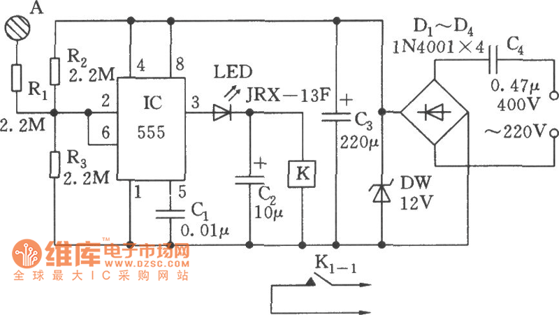 As shown in the figure, this circuit is composed of a depressurization and rectification circuit and a 555 trigger. When a hand touches the metal A, the induction signal will turn the comparator within 555 to set, K will be actuated and contact K1-1 will close; another trigger of A will release K and, disconnect K1-1.