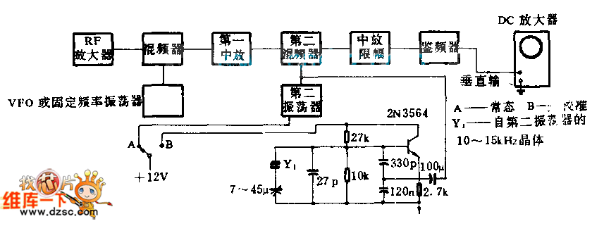 This circuit uses the same simple crystal oscillator and oscilloscope of carrier frequency deviation from center frequency with the fixed or adjustable FM receiver. The vertical amplifier of the oscilloscope uses the direct couple mode. To calibrate the tuned oscillator and display the figure higher than the receiver's second vibration 10KHZ or lower than the receiver's second vibration 15KHZ, we need to calibrate the oscilloscope screen. Because the transmitter's frequency is equal in the two channels, so we just need to adjust one oscilloscope.