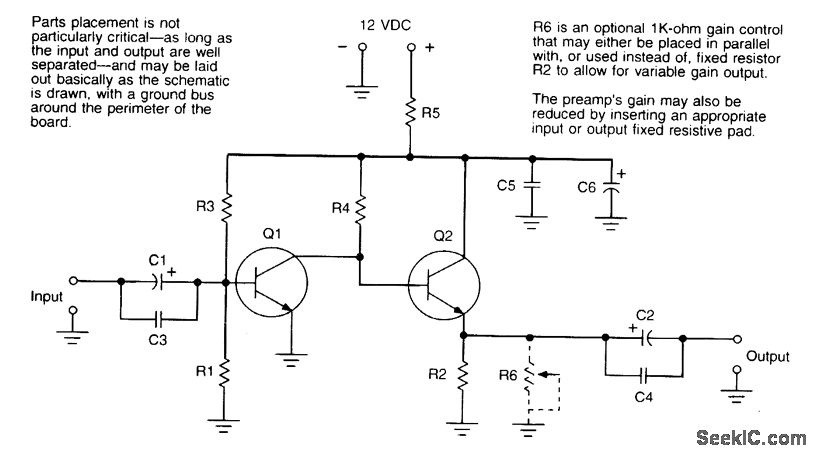 This preamp has a galn of35 dB at 100 kHz,30 dB at 10 MHz,and 17 dB at 100 MHz and draws 15 mA at 12 V.