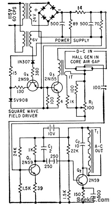 D-c signal voltage to be chopped is applied as control current of Hall generator. Magnetic field for generator is pulsed at 60 cps by driver circuit. Output is pulsating d-c voltage that is product of the two inputs. Error in input d-c versus output a-c is 2.5% for tem-perature range of -20 to 50℃. Can be used as d-c, a-c, or r-f microammeler.-T. J. Marcus, Highly Sensitive Electronic Chopper, Electronics, 32:40, p67-68.
