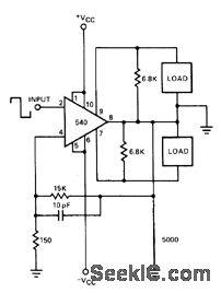 Signetics 540 power driver handles either push-pull or single-ended inductive loads such as relays, solenoids, motors, and electric hammers. In push-pull connection shown, load is driven in either positive, negative, or both arms of output. Either output can be selected by appropriate choice of input pulse polarity. Supply can be ±5 to ±25 V.- Signetics Analog Data Manual, Signetics, Sunnyvale, CA, 1977, p 764.