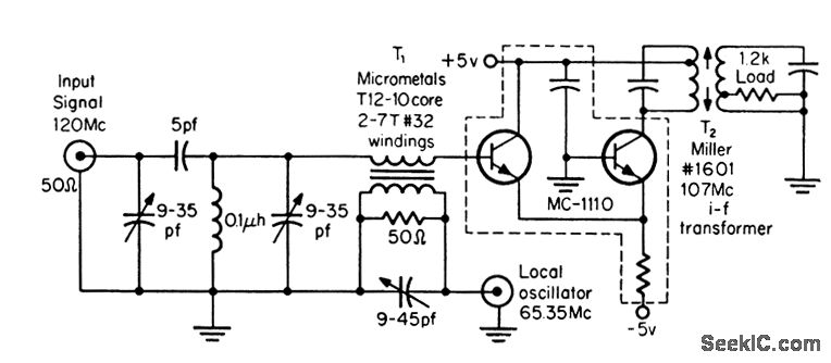 Two-transistor integrated circuit is used in nonlinear mode for converting 120 Mc to 10.7 Mc with conversion of 29.4 db, noise figure of 11 db, and sensitivity of -105 dbm. Bandwidth, including i-f stages that follow mixer, is about 500 kc.-J. E. Thompson, An Integrated Harmonic Mixer, Motorola Application Note AN-154, December, 1965.