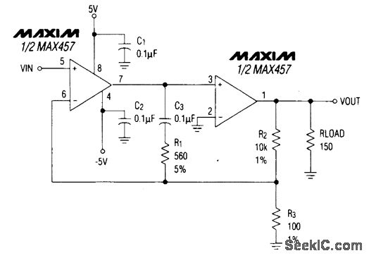 You can build a composite amplifier featuring high gain, wide bandwidth, and good dc accuracy by cascading the sections of a dual video amplifier and adding two appropriate phase-compensation components. The op amp drives a 150-Ω load and provides a closed-loop gain of 40 dB.