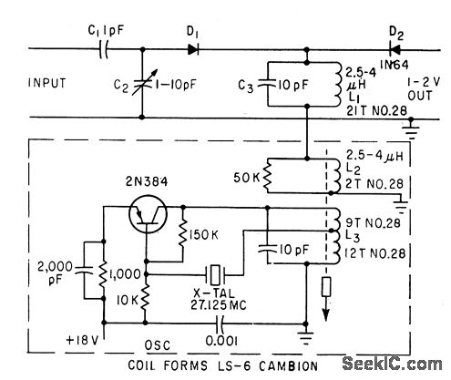Wide-band amplifier uses diode biased with r-f to give 40-db gain. Input impedance is above 10 gigohms, and frequency response is within 3 db from 3 cps to 200 kc. Diode D1 is energy storage element. Crystal-controlled transistor oscillator is pump frequency source.-D. Rovefi, Diode Amplifer Has Ten.Gigohm Input Impedance, Electronics, 34:51, p 38-40.