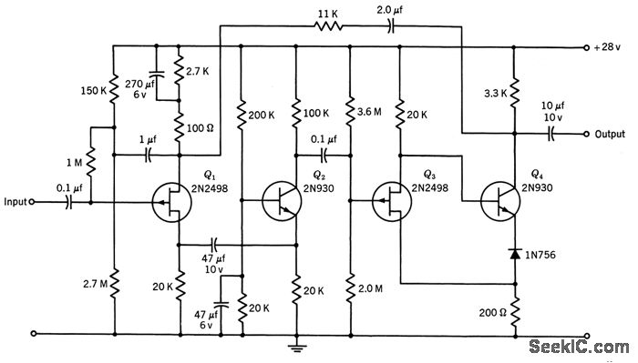 Gives input impedance of 30 meg without sacrificing bandwidth or noise performance.Voltage gain is 40 db, Technique involves bootstrapping fet Q1 and using fixed bias for its gate. Q2 is operoted grounded-base to reduce Miller capacitance of field effect at high frequencies.-Texus Instruments Inc., Transistor Circuit Design, McGraw-Hill,N.Y.,1963, p 520.