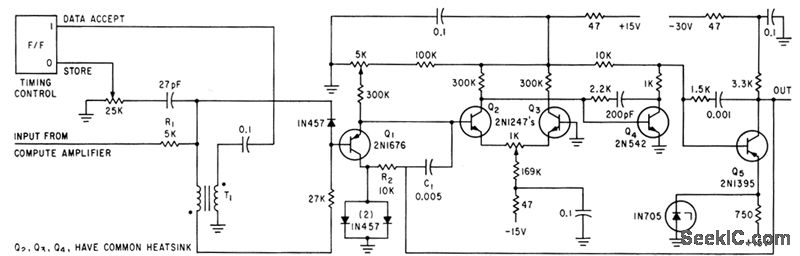 Samples output of compute amplifier at end of each word, to provide d-c output for serial decoder and permit timesharing of computer amplifier. Full-scale output is -10 v d-c.-R. M. Centner and J. R. Wilkinson, New Approach to Serial Decoding. Eliminates Static Storage, Electronics, 35:34,p 32-35.