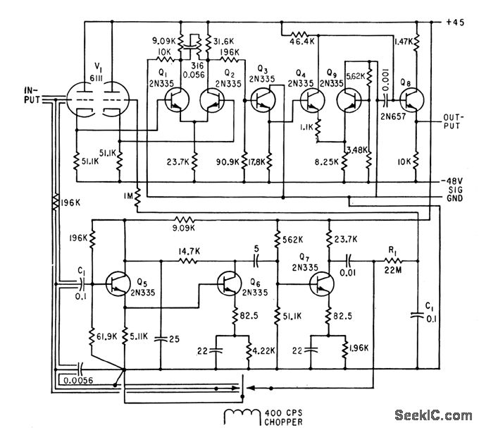 Uses Goldberg chopper-stabilized principle for d-c drift correction. D-c gain is 900,000, input impedance 230,000 ohms, and output impedance 1,000 ohms. Generates -20 to +20v.across 10,000-ohm load at 0 to 800 cps.-R. L.Konigsberg, Designing Hybrid D.C Amplifiers to Withstand Missile Environments, Electronics,34:32, p157-159.