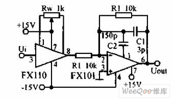 High input impedance of broadband amplifier circuit is shown in the graph below.The first level is a voltage follower, with the typical value of input bias current 1nA ,difference-mode input resistance 1012Ω, input capacitance 1.5 pF and small signal bandwidth 20MHz. The second level has negative feedbacks, and C2 will constitute a feed-forward compensation. The potentiometer is used to adjust the offset voltage of FX110.The accuracy of resistance R1, R2 is 1%.