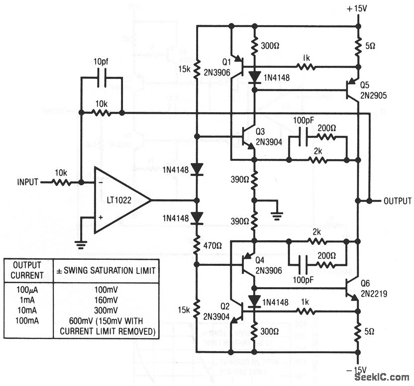 This circuit features rail-to-rail output swing, but with currents higher than with the circuits of Figs. 1-10 and 1-11. Bandwidth is 600 kHz, and slew rate exceeds 24 V/μs under 100-mA output loading.