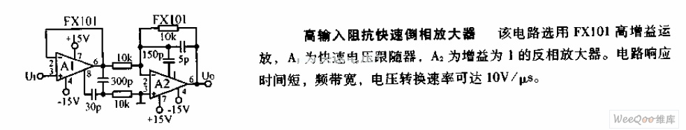The circuit uses FX101 high gain op amp, A1 is a rapid voltage follower, A2 is an inverting amplifier with the gain of 1. The circuit response time is short, frequency bandwidth is wide, voltage slew rate is up to 10V/μs.