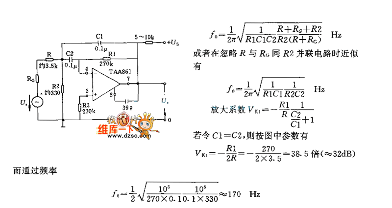 The ordinary selective amplifier adopts double T network, it requires thatthe component parameters have high precision. But if you use the circuit as shown in the figure, you can avoid it. At the low pass, the passing frequency f0 is determined by C1, and by C2 at the high pass.