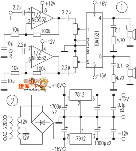 The amplifier part uses fidelity Manifold TDA1521, and its peripheral integrated circuit is extremely simple, and it has overheating, squelch, short circuit and other protection circuits, and it is suitable for homemade beginners. The first class uses the NE5532 for 10 times line amplifier. The coupling capacitor can use domestically CBB capacitors or tantalum capacitors. The previous level power can be gotten by 7815,7915 regulator, and the power transformer should use more than 30W. Bridge rectifier can use 3A full bridge. Amplifier part is shown in Figure 1, the power part of the circuit is shown in Figure 2.