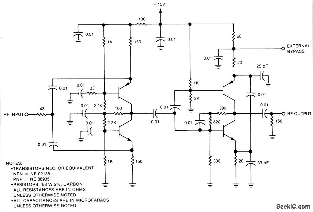 This wideband RF isolation amplifier has a frequency response of 0.5 to 400MHz±0.5dB. This two stage amplifier can be used in applications requiring high reverse isolation, such as receiver intermediate-frequency (IF) strips and frequency distribution systems. Both stages use complementary-symmetry transistor arrangements. The input stage is a common-base connection for the complementary circuit. The output stage, which supplies the positive gain, is a common-emitter circuit using emitter degeneration and collector-base feedback for impedance control.