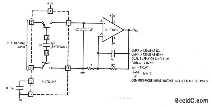 LTC1043 and LT1013 dual op amps are used to create a dual instrumentation amplifier using just two packages. A single DPDT section converts the differential input to a ground-referred single-ended signal at the LT1013's input. With the input switches closed, C1 acquires the input signal. When the input switches open, C2's switches close and C2 receives charge. Continuous clocking forces C2's voltage to equal the difference between the circuit's inputs. The 0.01-μF capacitor at pin 16 sets the switching fre-quency at 500 Hz. Common-mode voltages are rejected by over 120 dB and drift is low.