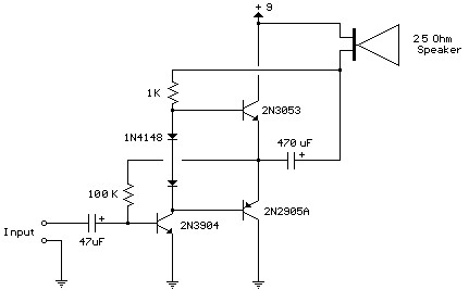 This circuit is similar to the one above but uses positive feedback to get a little more amplitude to the speaker. I copied it from a small 5 transistor radio that uses a 25 ohm speaker. In the circuit above, the load resistor for the driver transistor is tied directly to the + supply. This has a disadvantage in that as the output moves positive, the drop across the 470 ohm resistor decreases which reduces the base current to the top NPN transistor. Thus the output cannot move all the way to the + supply because there wouldn't be any voltage across the 470 resistor and no base current to the NPN transistor.