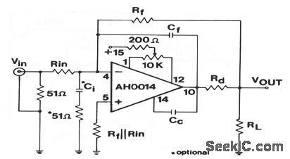 This circuit shows an AH0014 connected as an inverting wideband amplifier, where gain must be less than 10, but more than 1. The characteristics are the same as for the circuit of Fig. 3-49, but layout is more critical. Keep all leads as short as possible. Solder chip capacitors (bypass capacitors) directly to the chip pins. Use a ground plane. For best results, use an Ri of 1 kΩ or less, and keep Ci in the 15- to 60-pF range (use a variable Ci and adjust for best results. Figure 3-48B shows external connections for the AH0014.