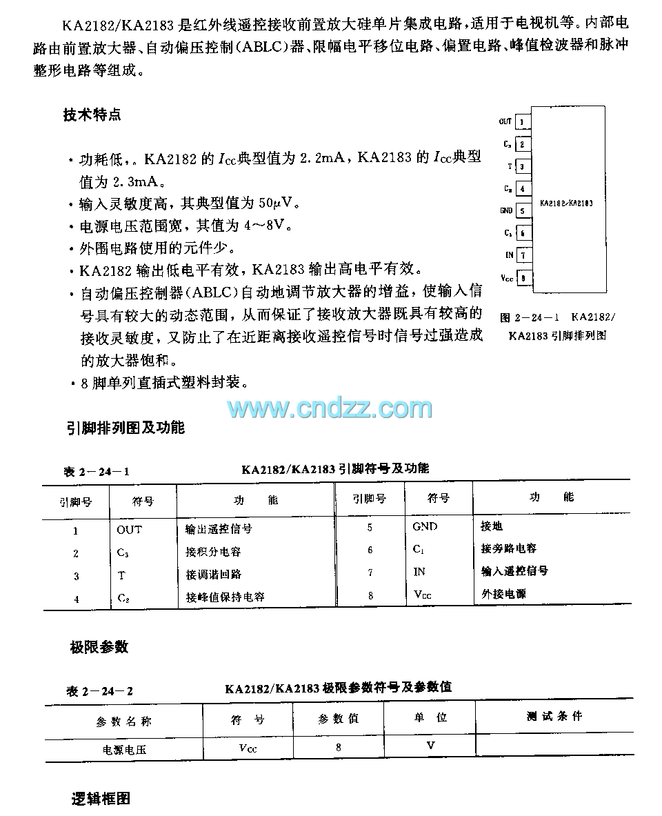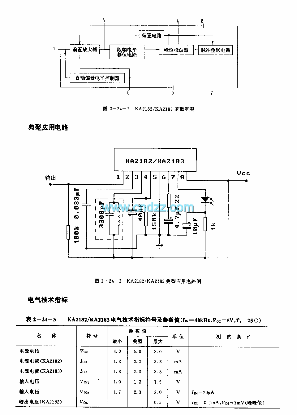 Low power consumption. The Icc typical value of the KA2182 is 2.2mA, the Icc typical value of the KA2183 is 2.3mA.High input sensitivity, the typical value is 50uV.Wide input voltage range, the value is 4-8V.Little external components.The output low level of the KA2182 is effective, The output high level of the KA2183 is effective.