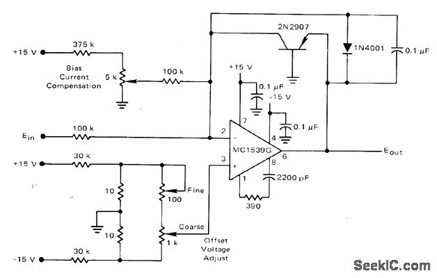 Motorola MC1539G opamp is connected with PNP transistor as logarithmic element. Circuit requires external compensation, has about 200-nA bias current, and accommodates wide range of input voltages when appropriate networks are used to compensate for errors. To adiust bias current initially, replaee transistor with 500K resistor and ad just 5K pot for gain of 5 over input signal range.-K. Huehne, Transistor Logarithmic Conversion Using an Integrated Operational Amplifier, Motorola, Phoenix, AZ, 1971, AN-261A, p 4.