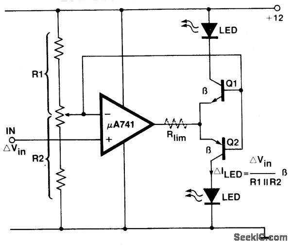 An op amp is used as a comparator and a sink for LED current. The output voltage of the amplifier changes about 1.4 V depending on the direction of the current. Only one transistor is on at any time. Maximum LED current is limited to 25 mA by overcurrent protection of the μA741. If LEDs are not Capable of carrying such a current or an alternative op amp is used and an additional resistor Rlim is necessary.
