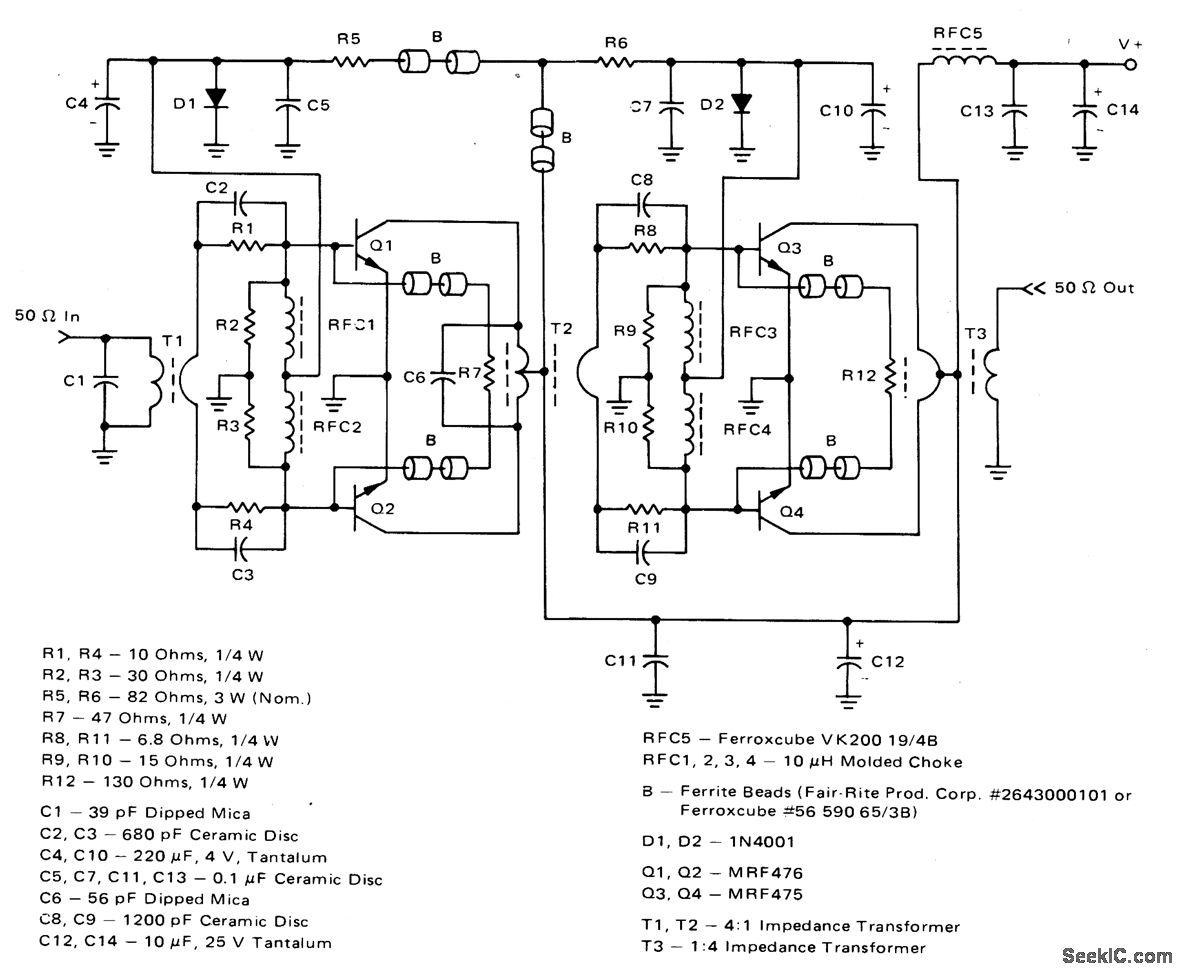 The amplifier provides a total power gain of about 25 dB, and the construction technique allows the use of inexpensive components throughout. The MRF476 is specified as a 3 watt device and the MRF475 has an output power of 12 watts. Both are extremely tolerant to overdrive and load mismatches, even under CW conditions. Typical IMD numbers are better than -35 dB, and the power gains are 18 dB and 12 dB, respectively, at 30 MHz. The bias currents of each stage are individually adjustable with R5 and R6. Capacitors C4 and CIO function as audio-frequency bypasses to further reduce the source impedance at the frequencies of modulation. Gain leveling across the band is achieved with simple RC networks in series with the bases, in conjunction with negative feedback. The amplitude of the out-of-phase voltages at the bases is inversely proportional to the frequency as a result of the series inductance in the feedback loop and the increasing input impedance of the transistor at low frequencies. Conversely, the negative feedback lowers the effective input impedance presented to the source (not the input impedance of the device itself) and with proper voltage slope would equalize it. With this technique, it is possible to, maintain an input VSWR of 1.5:1 or less than 1.6 to 30 MHz.