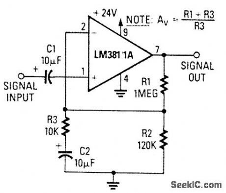 This low-noise LM381/1A noninverting ampli-fter has a gain of 100.
