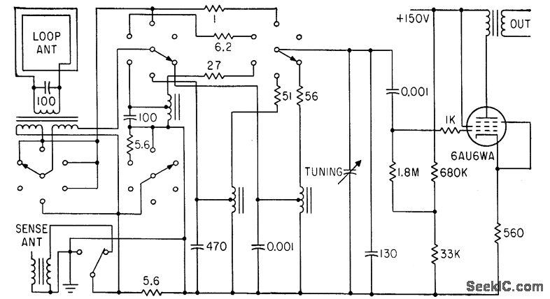 Negative feedback provides stability, yet gain is sufficient so noise contributions of preamplifier to 15-500 kc direction-finding receiver are negligible. Output of preamp feeds receiver through 100 feet of 100-ohm balanced transmission line.-L. E. Orsak and D. W. Martin, Direction Finding at Low Frequencies, Electronics, 33:38, p 74-77.