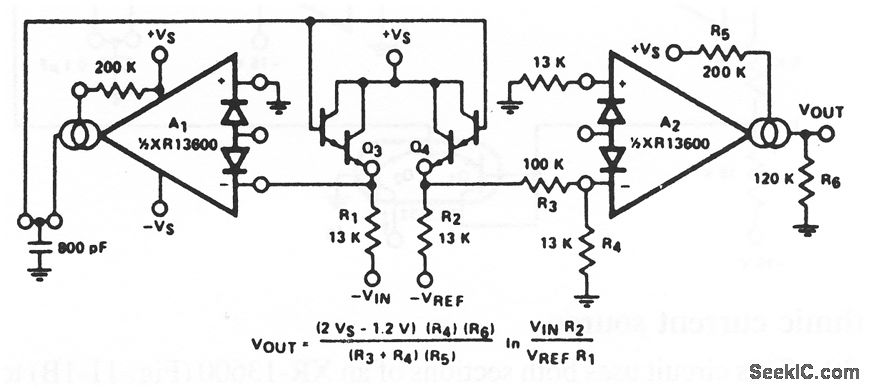 This circuit uses both sections of an XR-13600 (Fig. 11-1B) to form a log amplifier. The amplifier responds to the ratio of current through Q3/Q4. Zero temperature dependence for VOUT is ensured because the TC of the A2 transfer function is equal and opposite to the TC of the transistors. EXAR Corporation Databook 1990 p 5-258