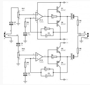 The Low Power Amplifier 2 x 100 mW circuit is based on the combination of op amp and an output stage push-pull with two transistors to charge more than a few mA and assuring to have few mW required for comfortable listening.The voltage gain is about 10 (20 dB), and corresponds to the ratio of resistors R3 / R2 for the left channel and R7 / R6 to the right path.