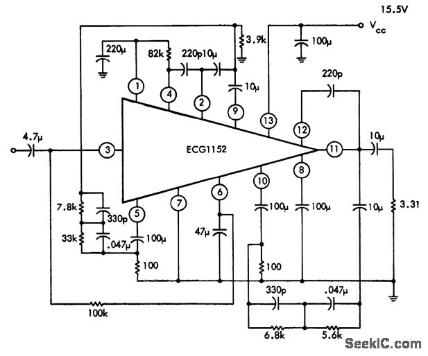 Low-noise preamplifier using an ECG1152 13-pin module. The ECG1152 is a dual two-stage direct-coupled amplifier. Typical voltage gain is 75 dB. Input resistance is 50K (courtesy GTE Sylvania Incorporated).
