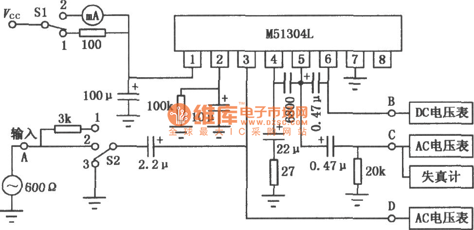 M51304L is microphone amplifier circuit. It uses 8-pin single inline package. The power supply voltage is 8~15V with low noise. There is automatic gain control (AGC) circuit inside. You can adjust the sensitivity of agc though external resistor. It is suitable for the microphone amplifier of micro recorder. The typical application circuit diagram is shown as below.