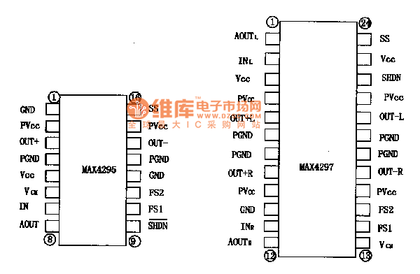 MAX4295 and MAX4297 are the latest switching (D class) audio amplifiers produced by U.S. MAXIM (Maxim), and it is widely used in pronunciation electronic products, such as walkman notebook computers, music cards, mobile phones and other battery-powered electrical products, and you can maximize battery life. 1. The internal block diagram and pin functions The MAX4295 is a mono amplifier, MAX4295 is the dual-channel amplifier. It is composed of the voltage reference, input buffer amplifier, oscillator, PWM modulator, power driver and MOSFET and other components.