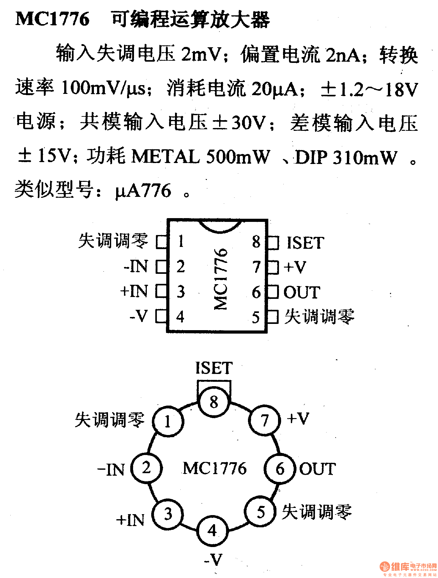 2mV input offset voltage; 2nA bias current; 100mV/μs conversion rate; 20μA current consumption; ± 1.2 to 18V power supply; ± 30V common-mode input voltage; ± 15V differential-mode input voltage; 500mW METAL and 310mW DIP power consumption. Similar model: μA776.
