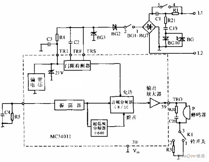 MC34011 ringing circuit is shown as above,the carrier ring signal sent by L1,L2 is sent into the ringing signal processing circuit of MC3401 after the bridge rectifying(threshold detection,comparison frequency division,output amplification, etc.).The ring signal is sent out from 39 pin to the buzzer.The loudness of the buzzer is controlled by K1 switch,when K1 is set at 1 ,the buzzer rings;when K1 is set at 2 ,the buzzer is light.